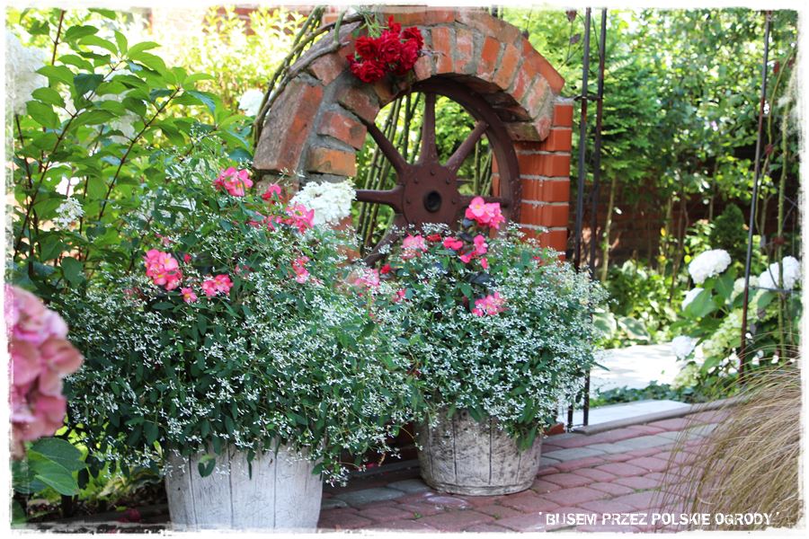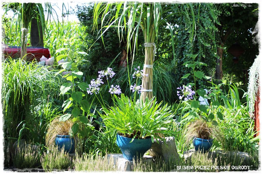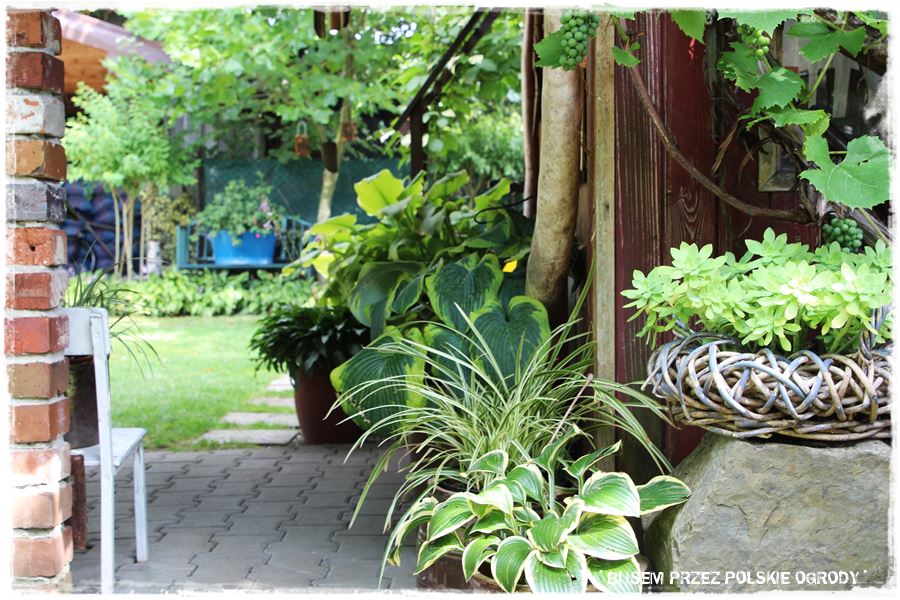 Wątek roślinny w tym gęstym ogrodzie, to również pięknie wkomponowane nasadzenia w donicach, których rolę poza tradycyjnymi pojemnikami, pełnią również zaadoptowane stare naczynia czy beczki. Moim zdaniem idealnie wpasowują się w klimat tego ogrodu.
