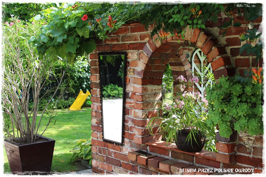 Furtka ta z kolei przylega do bocznej ściany garażu, który stanowi czwarty bok tej ogrodowej polanki. Natomiast jak to u Grażyny, nic nie może pozostać bez zaaranżowania. Stąd właśnie i na tą ścianę znalazła wyjątkowy sposób, co widać na powyższym i poniższym zdjęciu.