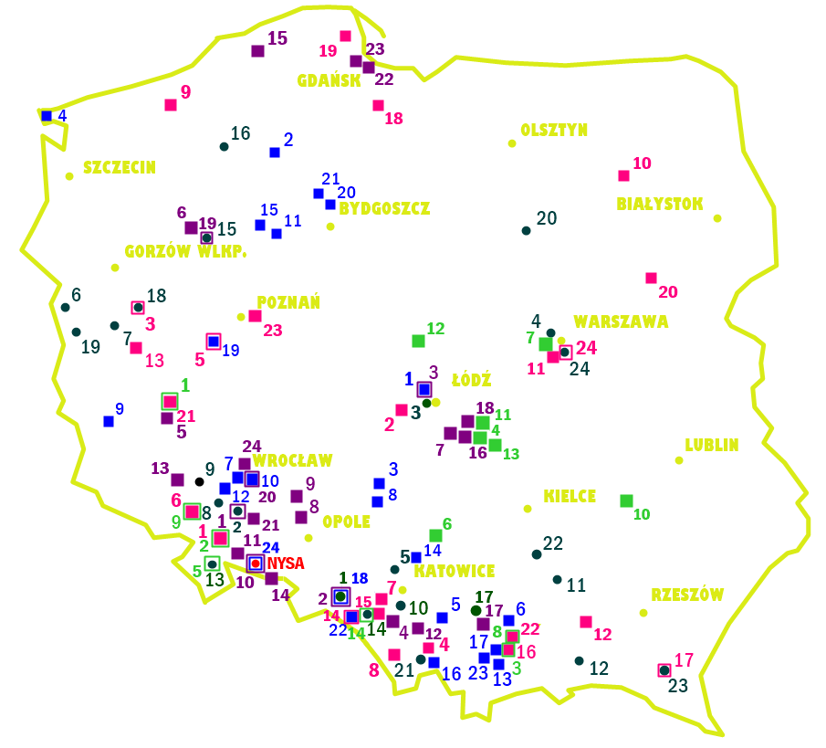 Kolor czerwony to tradycyjnie miejsce skąd wyruszyłem, a ten jasnozielony kwadrat z numerem 14, to właśnie lokalizacja czternastego ogrodu, położonego w województwie śląskim. Do pokonania miałem zatem niewielką odległość, około 160 kilometrów w jedną stronę. Na mapie widać również: