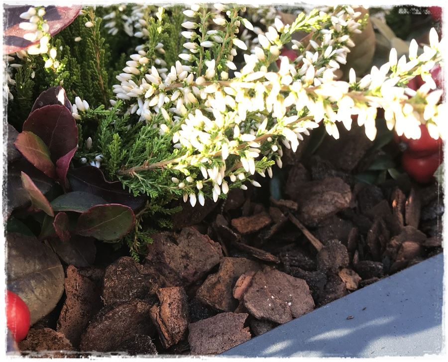 Uwaga: Prezentowane w kompozycji wrzosy potraktuję jednak sezonowo, gdyż nie chcę ich zakrywać. Ich zasuszone białe kwiatostany będą atrakcyjnie wyglądały aż do wiosny. Jeśli nie poradzą sobie w donicy bez przykrycia, na wiosnę zastąpię je innym gatunkiem.