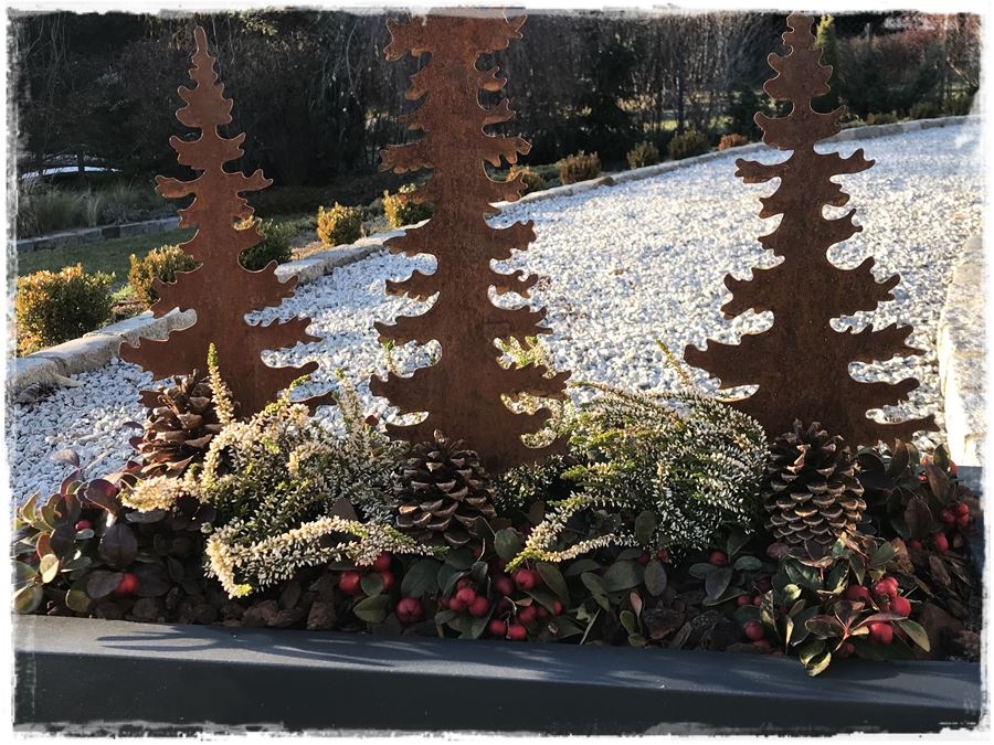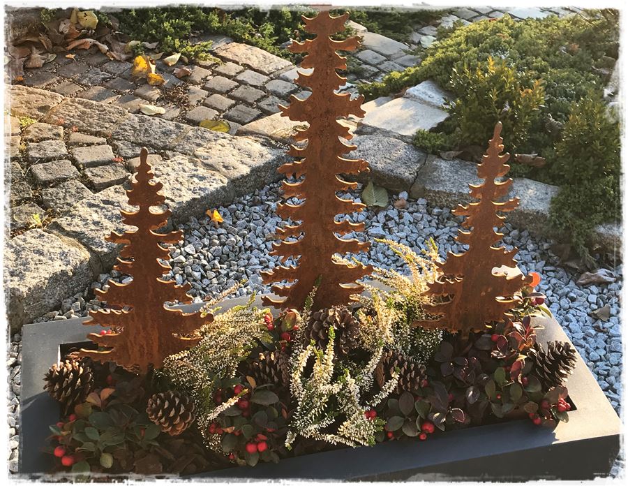 oraz przepięknie wykonane ozdoby z metalu pokryte rdzą, w kształcie choinek.