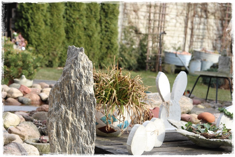 Jesteśmy na etapie uporządkowania ogrodu który ma 20lat ,przycinamy,przesadzamy rośliny ,jest to ciężka praca ale wierzę że warto.Mamy zamiar przerobić oczko wodne które jest już za małe,marzy nam się mały strumyk który będzie napowietrzał wodę i stworzy fajny klimat.Jedyny kamień jaki mamy to łupek wokół oczka,taka szpilka czy mniejsza czy większa dałaby niesamowity efekt .