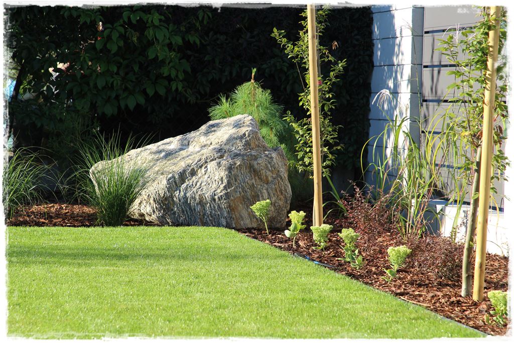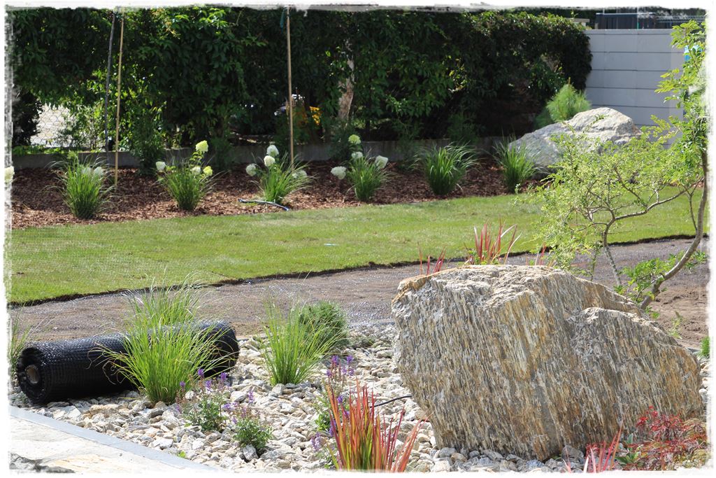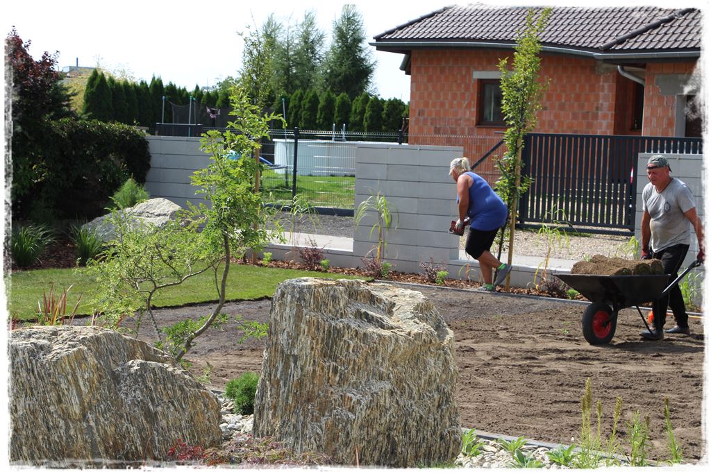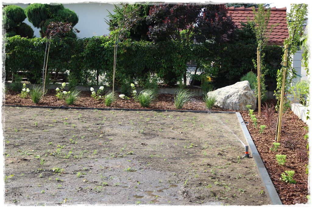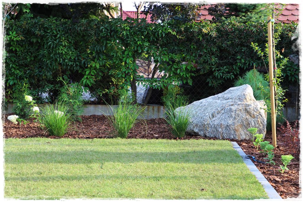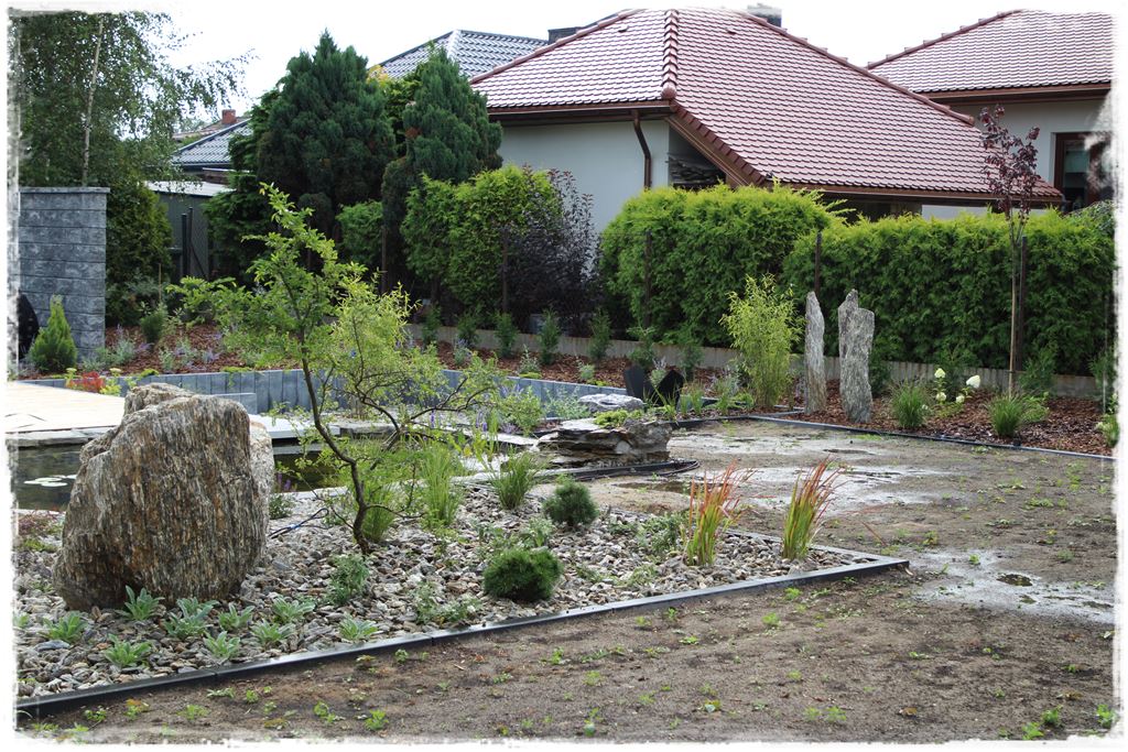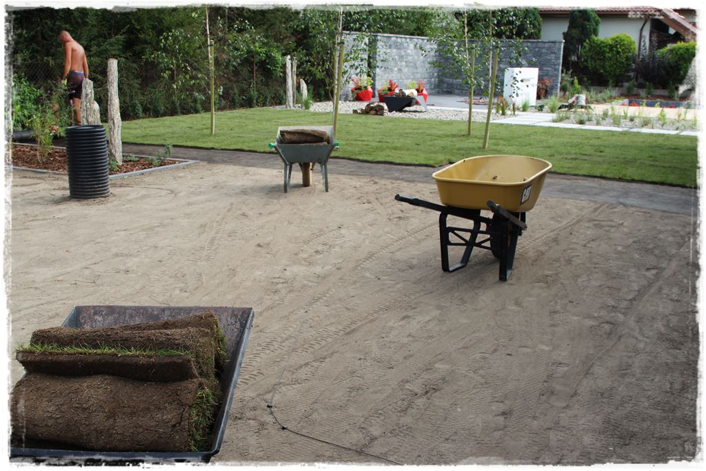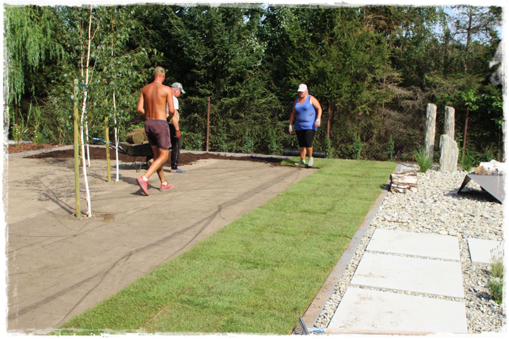 W każdym razie na tym etapie, ogród był już zrealizowany, jak wiesz z wcześniejszych postów są już nasadzenia, cała architektura, a także materiał ozdobny na rabatach. Pozostało tylko wypełnić obszary miedzy nimi, czyli ułożyć trawnik z rolki, który miał się wpisać w te dwa obszary.