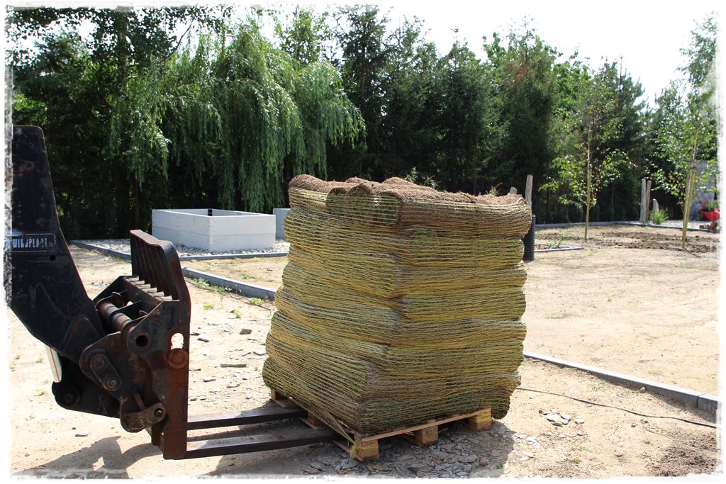 Równolegle z pracą zraszaczy, mniej więcej około godziny 10, pod mój ogród przyjechała trawa, zapakowana na paletach.