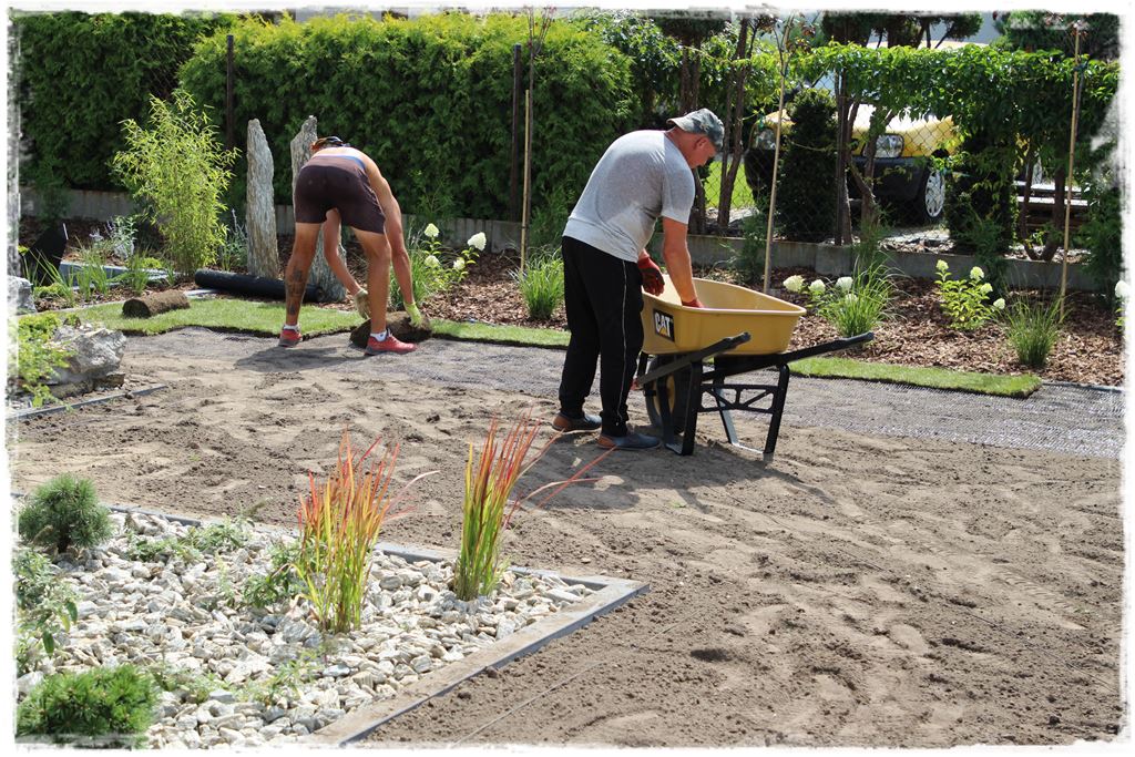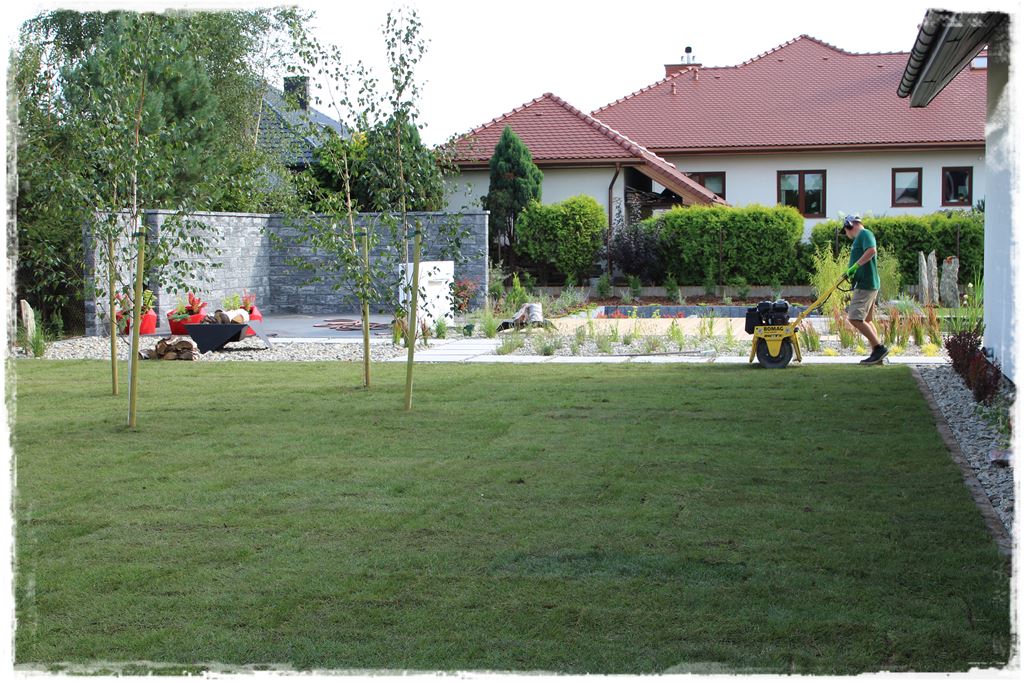 Realizacja trawnika z rolki, którą wykonaliśmy na tym etapie, to tak naprawdę już czynność końcowa, którą poprzedzało kilka elementów. A te elementy było to uprzednie równanie i profilowanie terenu, które wykonane było we wcześniejszych etapach realizacji ogrodu. Oczywiście było to przygotowanie zgrubne, czyli takie dosypanie, niwelowanie i równanie powierzchni terenu przyszłych trawników, do poziomów jakie wyznaczały wykonane obrzeża.