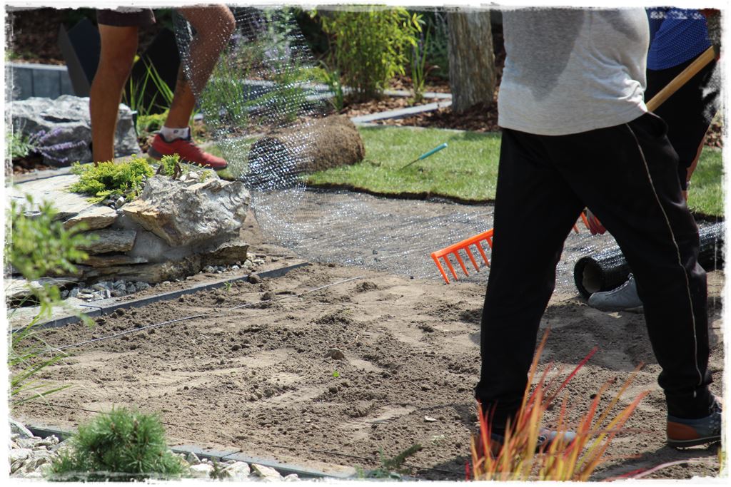 Krok kolejny to wzruszenie ziemi glebogryzarką, a następnie ręczne jej równanie, niwelowanie nierówności i profilowanie do docelowego poziomu, który przyjęty był na około minus 3 centymetry od przyległych obrzeży.
