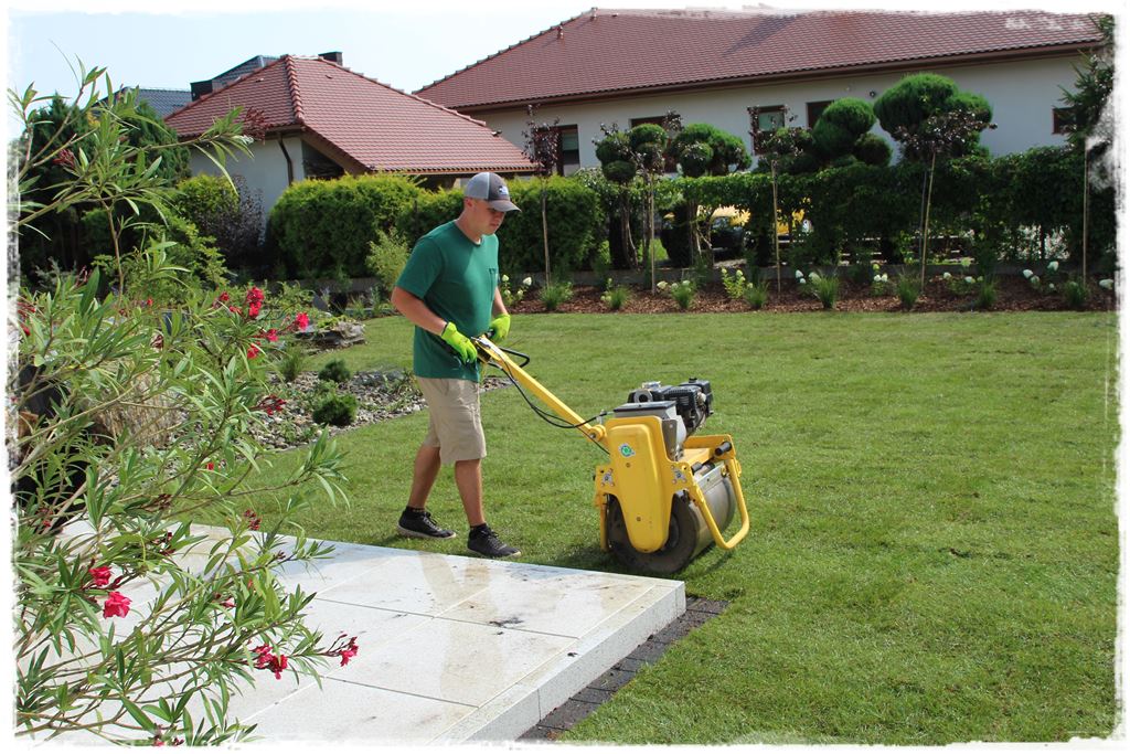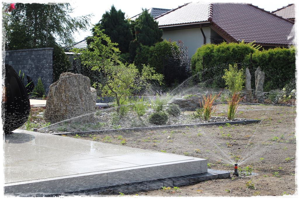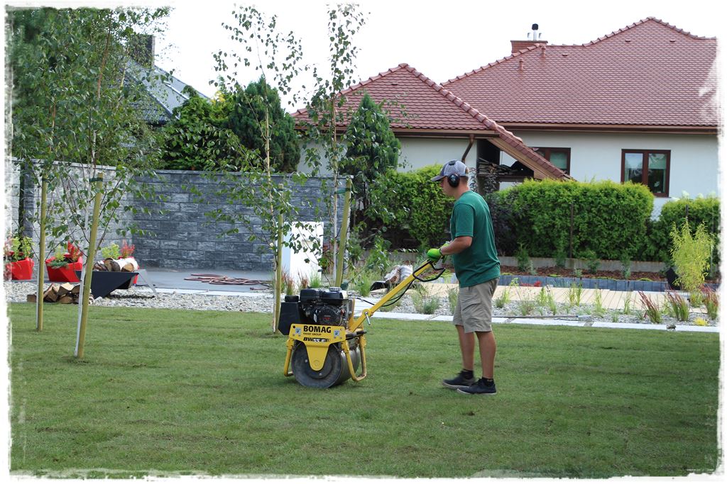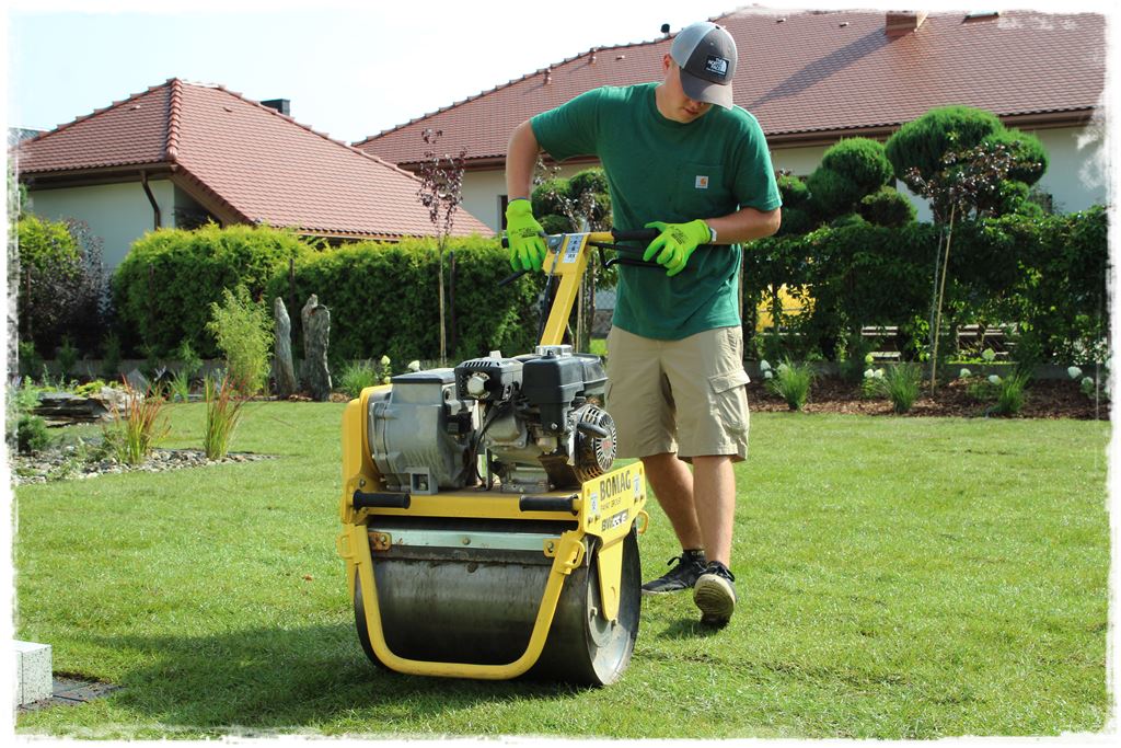 Ułożone trawniki, przed ubijaniem, trzeba było dobrze nawodnić. Czyli drugi test dla zraszaczy, a jednocześnie namoczenie całej powierzchni, aby stała się bardziej plastyczna.