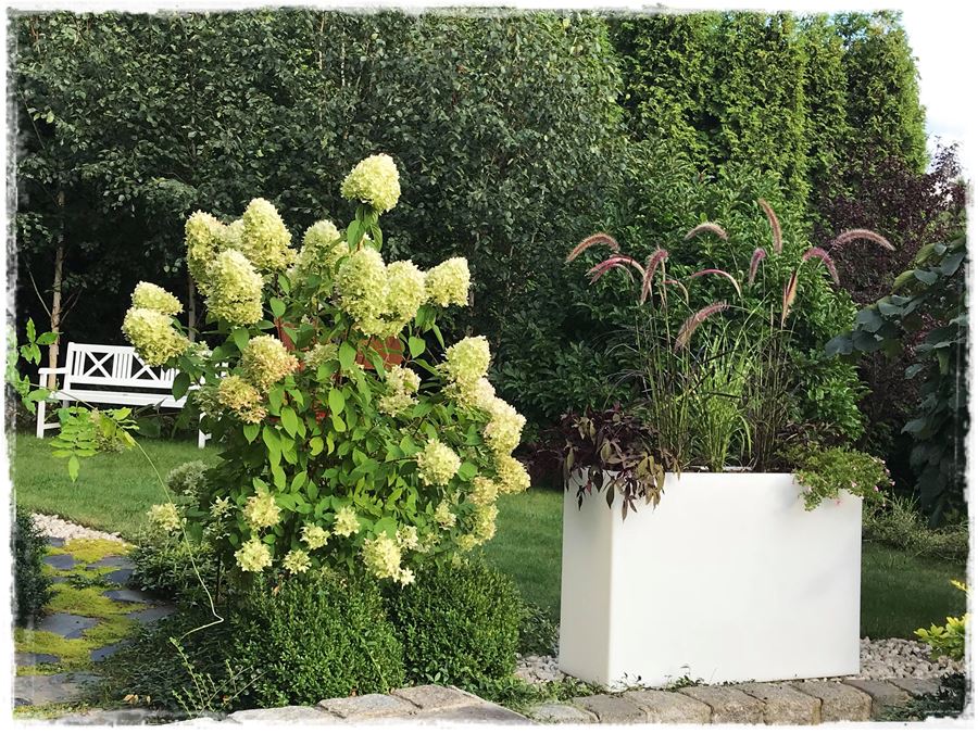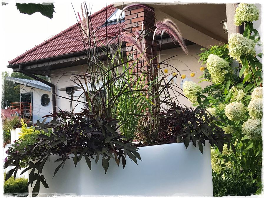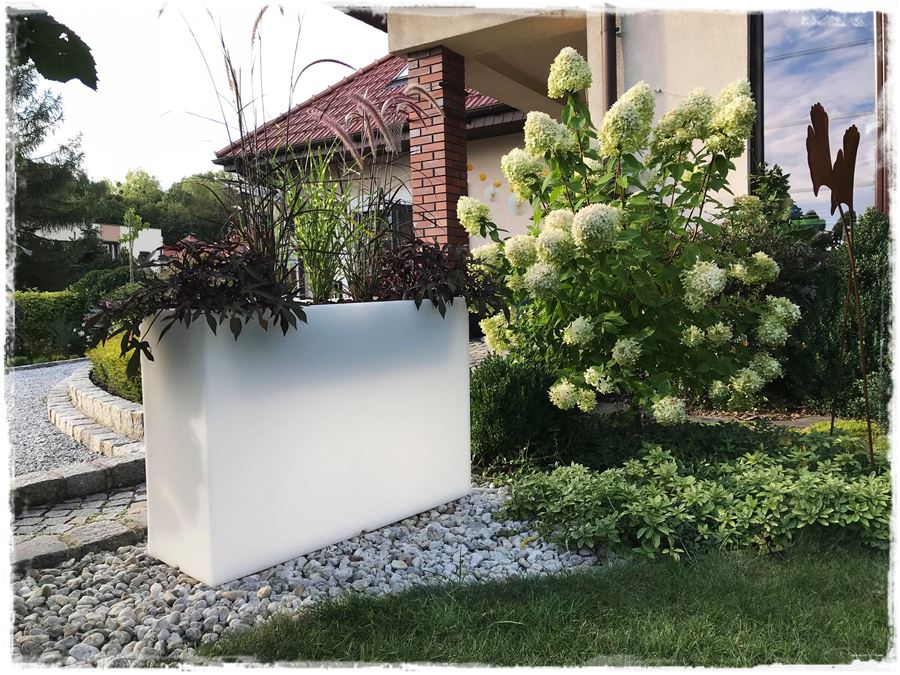 Do nowej, letniej kompozycji wybrałam jedną z donic LONGERINO 70 w kolorze białym, po którą ponownie sięgnęłam do oferty sklepu internetowego MODNE DONICE. Donica zachwyciła mnie piękną, prostą, geometryczną i „dizajnerska” formą, która doskonale prezentuje się na tle ogrodu.