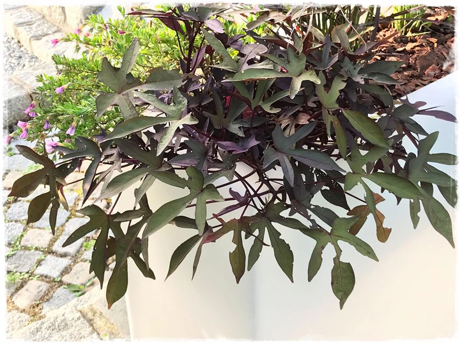 - Zestaw 2 sztuk wilca klapowanego „Purple” (Ipomoea batatas Purple) – posadzonego symetrycznie po obu stronach donicy,