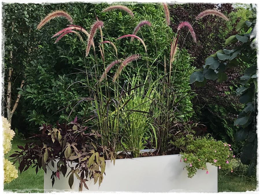 Do stworzenia letniej kompozycji roślinnej w donicach tego typu, warto wybrać przepięknie kwitnące o tej porze roku trawy ozdobne oraz połączyć je z bylinami o dekoracyjnym ulistnieniu. Donica Longerino jest minimalistyczna w formie, dlatego wymaga prostych zestawień. Występuje w 9 ciekawych kolorach, ale właśnie na tle białej, rośliny o kontrastowych kolorach wyglądają najciekawiej i najbardziej elegancko.