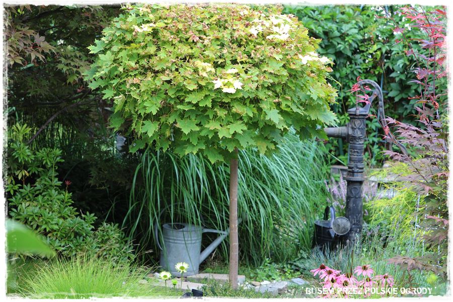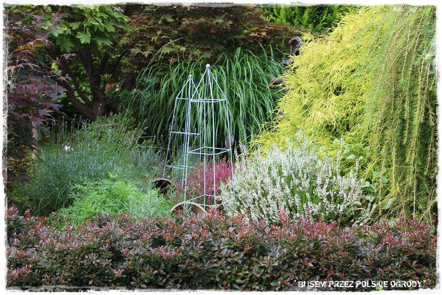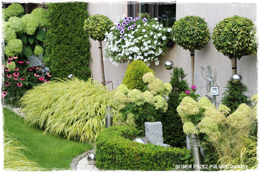 Ogród Gosi i Krzysztofa to tak naprawdę niewielka przestrzeń, tak mniej więcej około 6 – 7 arów. W jej centralnej części stoi budynek mieszkalny, wokół którego zaaranżowane są niewielkie rabaty, jak ta we frontowej części, której wyróżnikiem poza bukszpanową opaską, są szczepione na pniu trzmieliny.