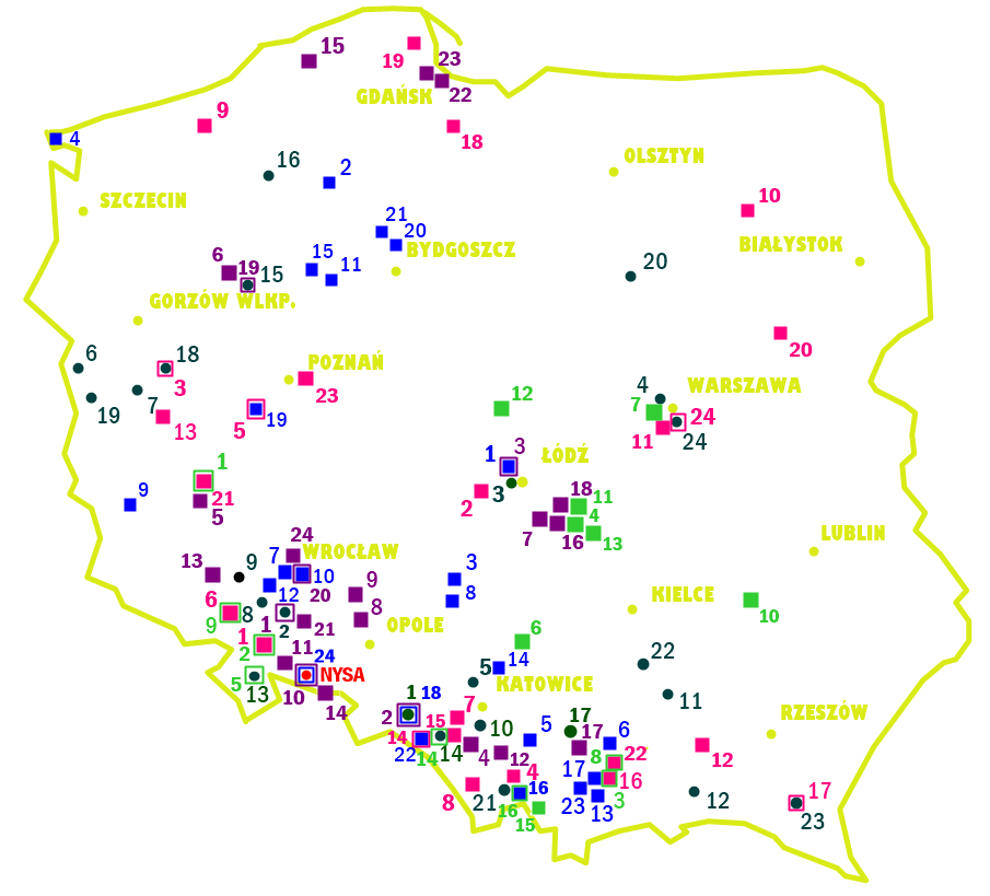 Kolor czerwony to tradycyjnie miejsce skąd wyruszyłem, a ten jasnozielony kwadrat z numerem 16, to właśnie lokalizacja szesnastego ogrodu, położonego w województwie śląskim. Do pokonania miałem zatem średnią odległość, około 240 kilometrów w jedną stronę. Na mapie widać również: