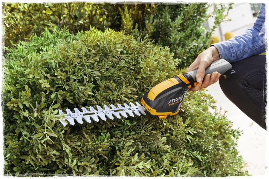 Doskonałym przykładem jest model Stiga SGM 102 AE, który zawiera nożyce do krzewów o średnicy 18 centymetrów przeznaczone do precyzyjnego cięcia żywopłotu oraz 10 – centymetrowe ostrze, które idealnie nadaje się do przycinania krawędzi trawnika. Co ważne, ostrza można szybko i łatwo przełączać za pomocą beznarzędziowego systemu klikania.