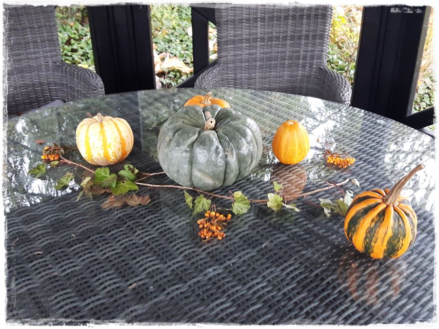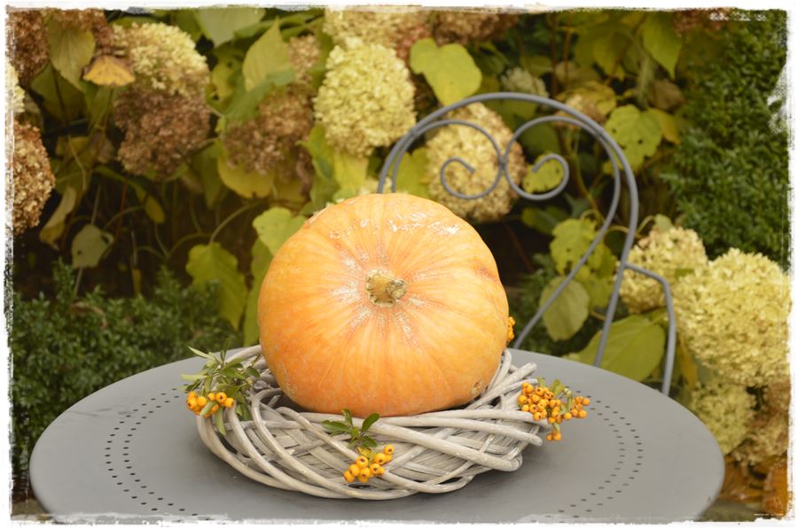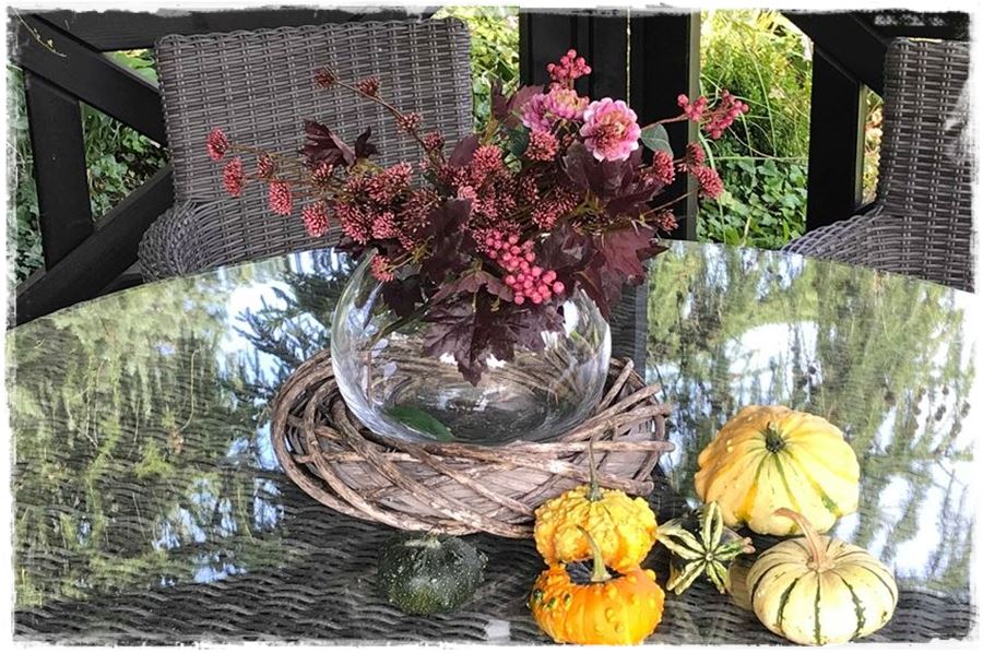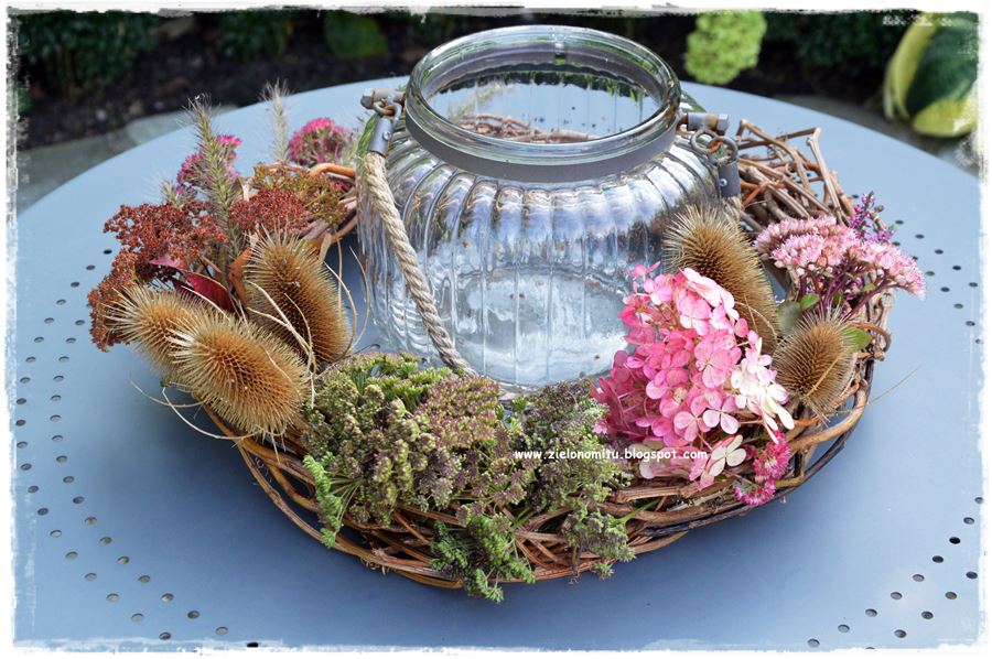 Oprócz kompozycji w donicach pomyśl o innych jesiennych dekoracjach do ogrodu. A jeśli nie masz pomysłu, skorzystaj z przedstawionych przeze mnie inspiracji. Rozejrzyj się wśród roślin rosnących w Twoim ogrodzie i spróbuj z ich wykorzystaniem stworzyć naturalny jesienny stroik, który może być ozdobą Twojego stolika ogrodowego.