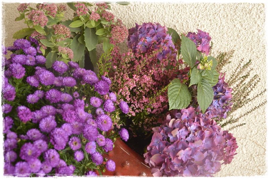 Wracając do omawianej kompozycji. Postawiłam w niej na róże i purpury, a zatem kolory jesieni, które symbolizują bogactwo i dobrobyt. Z tego też powodu pozytywnie oddziaływają na naszą psychikę. Uspokajają i może nieco skłaniają ku melancholii, ale taka właśnie jest jesień, kiedy po okresie obfitości w naszych ogrodach, przychodzi moment refleksji nad przemijaniem.