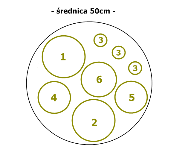 Dlatego podpowiemy Ci jak taką donicę przygotować, jakie dobrać gatunki ziół, aby z powodzeniem korzystać z ich cennych właściwości. Dostaniesz od nas szczegółowe wytyczne jak zioła posadzić, uprawiać, a nawet jak rozmieścić sadzonki w donicy. Oto przykład szkicu z jednego z poradników: